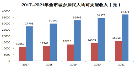 全年常住居民人均可支配收入24290元,增长9.9%。其中,城镇常住居民人均可支配收入37278元,增长8.5%;农村常住居民人均可支配收入15913元,增长10.8%。