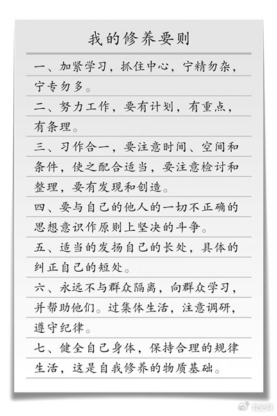 这天刚好是周恩来农历45岁生日。散会后,周恩来回到办公室,谢绝同志们为他祝寿,他反复回顾自己留学日本、法国和确立共产主义信仰以来的经历,为了随时警醒自己,他慎重地写下《我的修养要则》,共7条,以明心志。